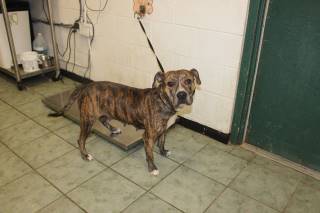 I am a female Pit Bull dog. I came to the shelter but I'm not sure why. I arrived at the shelter on October 13, 2025, in fair condition. The friendly shelter staff says I am medium sized and I am brindle and white. I am no longer at the shelter because I was returned to my owner!